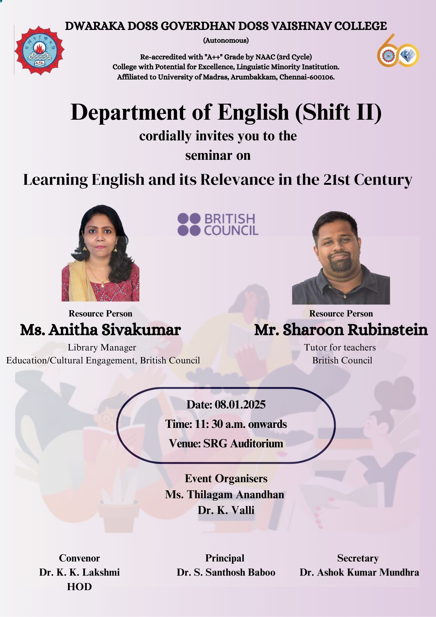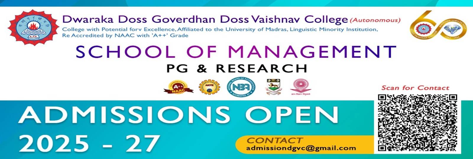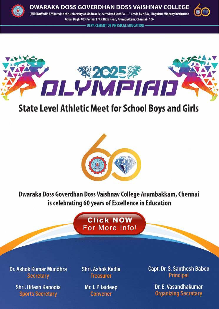 Dwaraka Doss Goverdhan Doss Vaishnav College, a linguistic minority institution established in the year 1964 by the Rajasthanis and Gujaratis settled in Chennai for the cause of higher education. DDGDVC is the best college with a sole purpose of imparting knowledge and value based education saw its grand day on 30th June 1964 with one course in B.Sc. Mathematics with Shri. Totadri Iyengar (teacher of Dr. APJ Abdul Kalam) as its first Principal. Dwaraka Doss Goverdhan Doss Vaishnav College has been a haven for generations of enthusiastic learners through five decades and more. College was founded on the principles of Vaishnavism, with the sole purpose of imparting value based quality...
